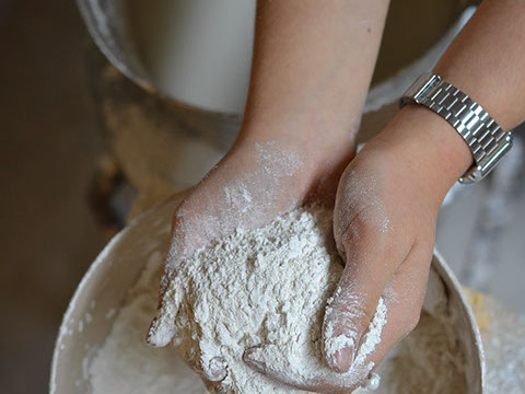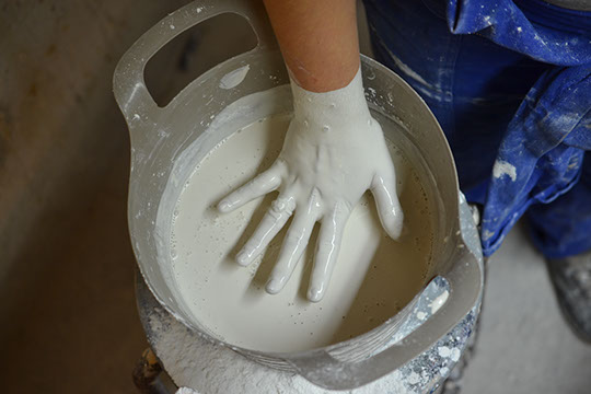 Saupoudrage du plâtre dans l’eau : début de la gâchée