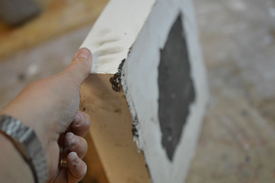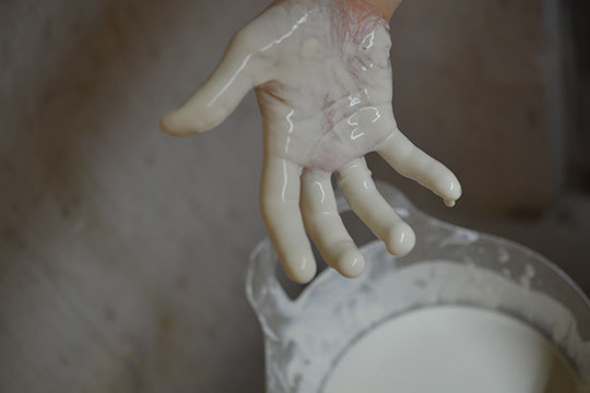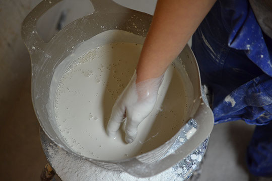 Le plâtre est coulé dans l’enterrage à partir d’un angle pour éviter les bulles