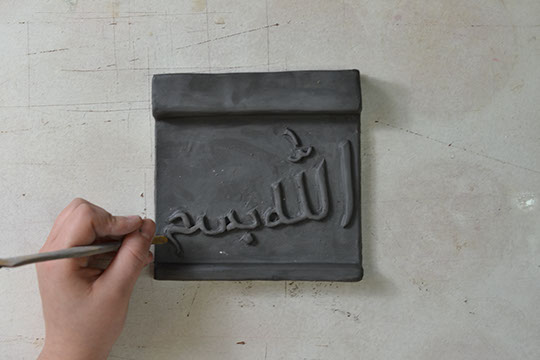 En partant du carreau, nous nous sommes rendus compte que certes, l’écriture avait un aspect sémantique fort mais que la calligraphie (persan, thuluth) avait été traitée comme un motif, a n d’occuper le plus d’espace possible (hautes hampes) en respectant l’esthétique de la peur du vide.
