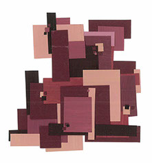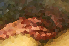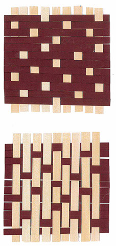 À gauche, nuances de pourpres juxtaposées très simplement, pas de jeux de lumière particulière car on distingue encore très clairement les « zones » de couleurs ; il n’y a pas de phénomène optiques, pas de mélanges. en revanche quand, comme à droite, on fragmente ces aplats colorés en petits modules que l’on juxtapose et superpose de manière beaucoup plus fine et précise, les couleurs en fragments tendent à se mélanger dans notre regard, ce qui crée un jeu cinétique mettant en jeu les différentes teintes, la saturation et la luminosité de chaque couleur jusqu’à donner l’illusion d’infinies nuances et de vibrations.