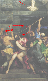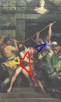 part des personnages qui tiennent les lances pour très vite se fixer sur la tête (juste au dessus) de Jésus + les lignes du bâti (l’escalier) invitent le regard à monter vers le haut, vers jésus.