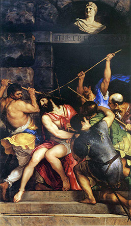 Le point de rencontre des lances est un triangle comme une auréole au dessus de la tête de Jésus : symbole trinité, Le Titien place un symbole divin alors que le tableau représente une scène dans laquelle les bourreaux de jésus le prennent pour un « imposteur ».