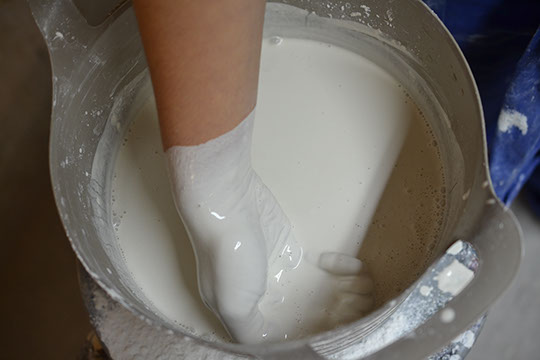 Saupoudrage du plâtre dans l’eau : début de la gâchée