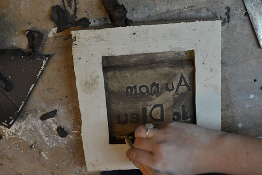 En réponse à cette problématique, et pour mieux expliquer la fabrication du carreau au public, nous avons décidé de faire des moules à carreaux d’estampages, d’en faire des tirages et ainsi de montrer les différentes étapes de fabrication.