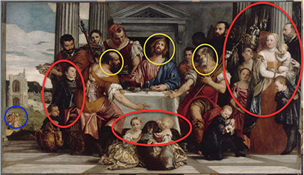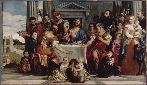 Cependant la représentation de la scène biblique reste centrale. En effet, le Christ se situe au centre du tableau. Il est entouré de ces deux pèlerins. Leurs corps, ainsi que leurs regards dirigent notre vu sur les mains du Christ. Autour de ce repas biblique, on observe une famille patricienne de Venise richement vêtue. Ce sont les commanditaires du tableau. Ils sont représentés dans leurs villa avec leurs 10 enfants, 4 domestiques, 2 chiens, et un chat. De ce fait, Véronèse entend mettre l’accent sur l’humanité du Christ et introduire le sacré dans la vie quotidienne. La scène biblique est un prétexte de réalisation d’un portrait collectif. C’est une représentation laïque d’un sujet religieux typique de l’esprit vénitien du 16e siècle. C’est ce mélange de sacré et de profane qui a conduit Véronèse au tribunal de l’Inquisition.