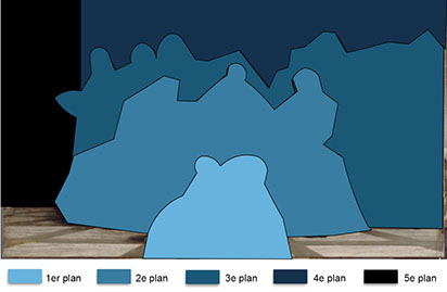 - 3/4= espace intérieur : neutre, dans les tons gris, composé de colonnes.
