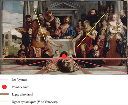 De plus, au Louvre le tableau est placé à une hauteur qui met le spectateur en contre plongée par rapport aux personnages du tableau. Notre regard se balade dans le tableau entre les différents plans. le tableau se lit à la verticale. Au premier plan, deux petites filles vêtues de riche brocard, indifférentes à ce qui se passe au-dessus d'elles, jouent avec un chien, tout comme le petit garçon un peu plus loin. L'une des jeunes filles regarde le spectateur. Elle attire ainsi particulièrement notre attention. Derrière ces jeunes filles, au deuxième plan Véronèse à représenter le Christ, entouré de deux pèlerins qui assiste au repas. Le christ est au centre du tableau. Au troisième plan se trouve les membres de la famille vénitienne. Ils entourent la table de repas. Cependant, aucun d’entre eux ne regarde la scène biblique qui se déroule à coté d’eux. De plus, on constate que les personnages sont tous a la même taille. L’échappée sur le paysage à gauche aère le tableau, lui donne de la profondeur.