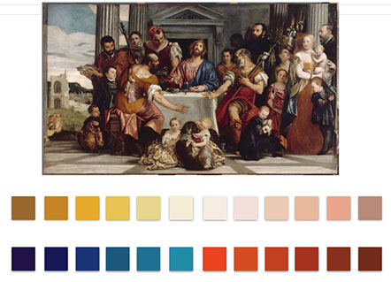 Palette claire, caractérisé d’une grande légèreté, sérénité. Le tableau est majoritairement composé de nuances d’ocres, de roses, de lilas, de jaune. On retrouve également du rouge. Cependant, au centre de la composition se trouve le christ vêtu d’un drapée bleu, couleur complémentaire des jaunes, ocres. Ainsi, Véronèse choisi de le mettre en valeur. (couleur chaude/ couleur froide)