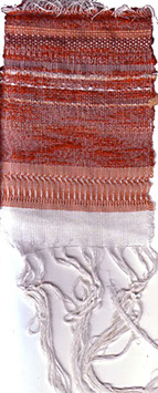 De plus, des motifs apparaissent sur les extrémités des textiles. En tissage nous avons voulu créer nos motifs textiles, toujours en lien avec la gamme coloré chaude et orangée des textile du tableau.