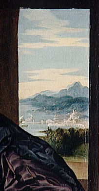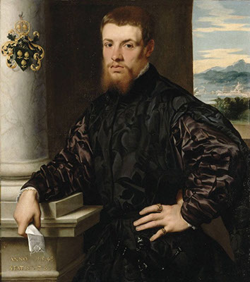 La couleur dominante du tableau reste le noir des vêtements et du fond ; et cependant des tons ocres sont présents de manière assez importante, se trouvant dans les éléments architecturaux, dans le bas du paysage, les cheveux et la barbe du personnage. Des touches de doré sont aussi disséminées dans le blason, les bagues et les écritures sur la colonne. On retrouve également des tons bleutés dans les montagnes lointaines du paysage. C’est au milieu de toutes ces nuances que se détachent les couleurs de la chair du personnage, faisant ainsi ressortir ses mains et son visage largement éclairés. On peut même comparer la texture des mains lisses et douces de ce personnage avec la texture de la colonne de marbre: il a des mains de marbre, et cette finesse est signe d’aristocratie... On peut également remarquer un contraste entre le paysage vu à travers la fenêtre et l’intérieur de la pièce où se trouve le personnage, donné par les couleurs, mais aussi par le flou du lointain et la précision du proche, de l’intérieur de la pièce; ce qui permet de créer une respiration dans ce tableau. Il s’agit certainement d’une vue de Venise: on distingue une ville au bord d’une large étendue d’eau, derrière laquelle se trouve un paysage de montagnes...