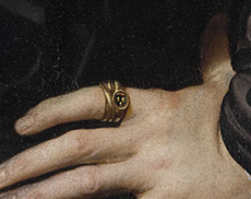 Le regard circule dans le triangle formé par les deux mains et le visage du personnage, tous les trois se détachant sur le vêtement noir. De petites touches plus claires, telles que le mouchoir, la dentelle autour des poignets et du cou, permettent de renforcer cette circulation triangulaire dans le tableau. On peut aussi détecter l’alignement du blason, de la tête et de la fenêtre. Une diagonale est créée par les couleurs similaires du mouchoir, en bas à gauche, et du paysage, en haut à droite.