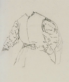 Nous allons maintenant nous pencher sur le costume du personnage. Il est composé d’un veston aux longues manches tombant dans le dos du personnage, sous lequel se trouve un autre vêtement aux manches bouffantes, le dernier élément est une culotte elle aussi bouffante. Nous pouvons également distinguer les sous-vêtements raffinés en dentelle, dépassant sur les poignets et le cou.